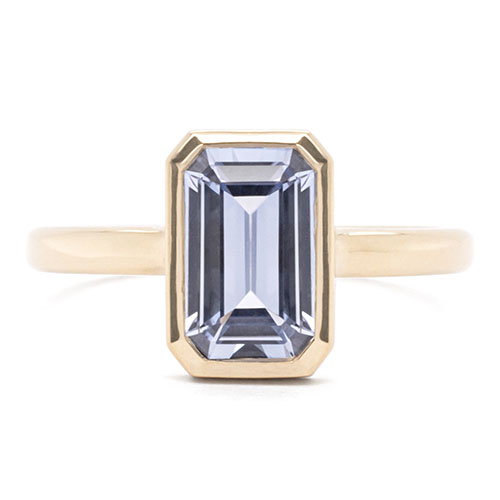 A refreshing take on the sapphire engagement ring, featuring a luminous periwinkle-hued emerald-cut sapphire framed in a sleek bezel setting — modern, elegant and quietly distinctive.